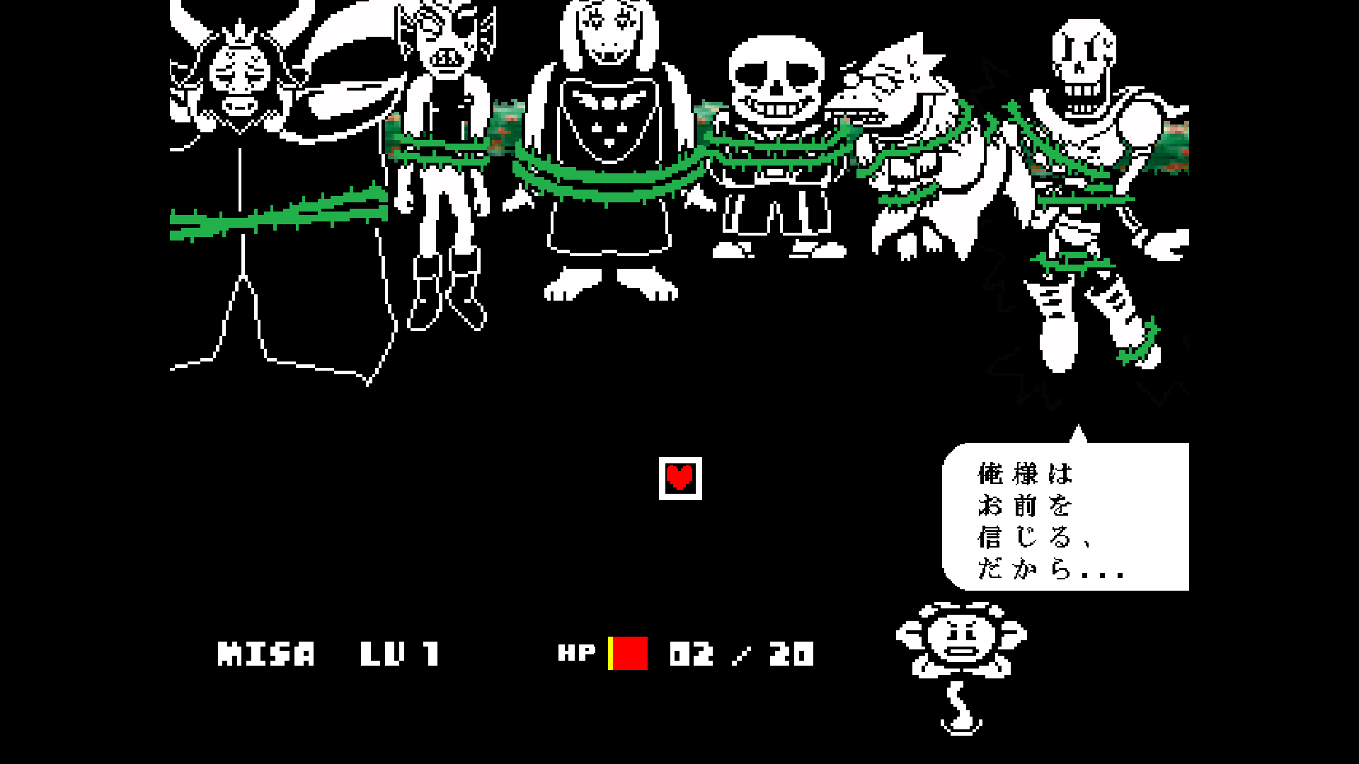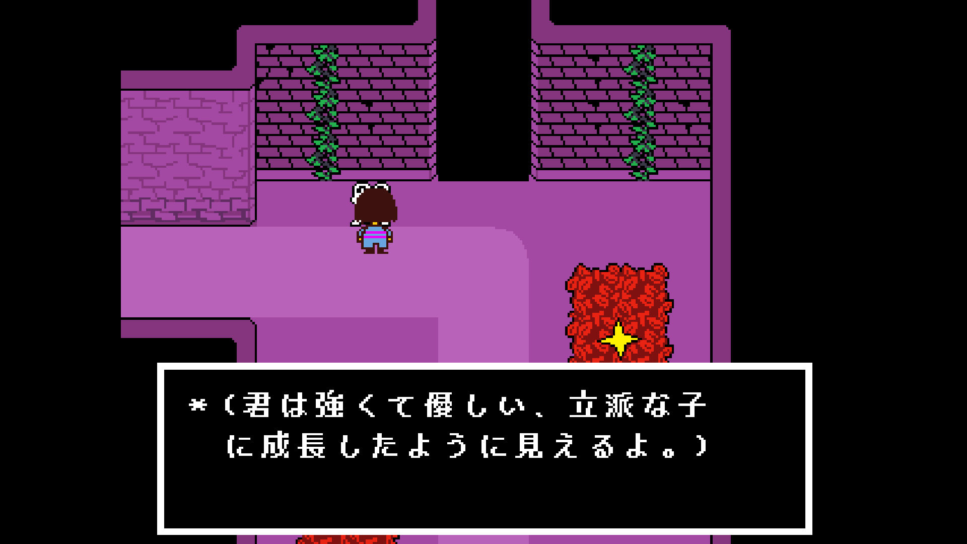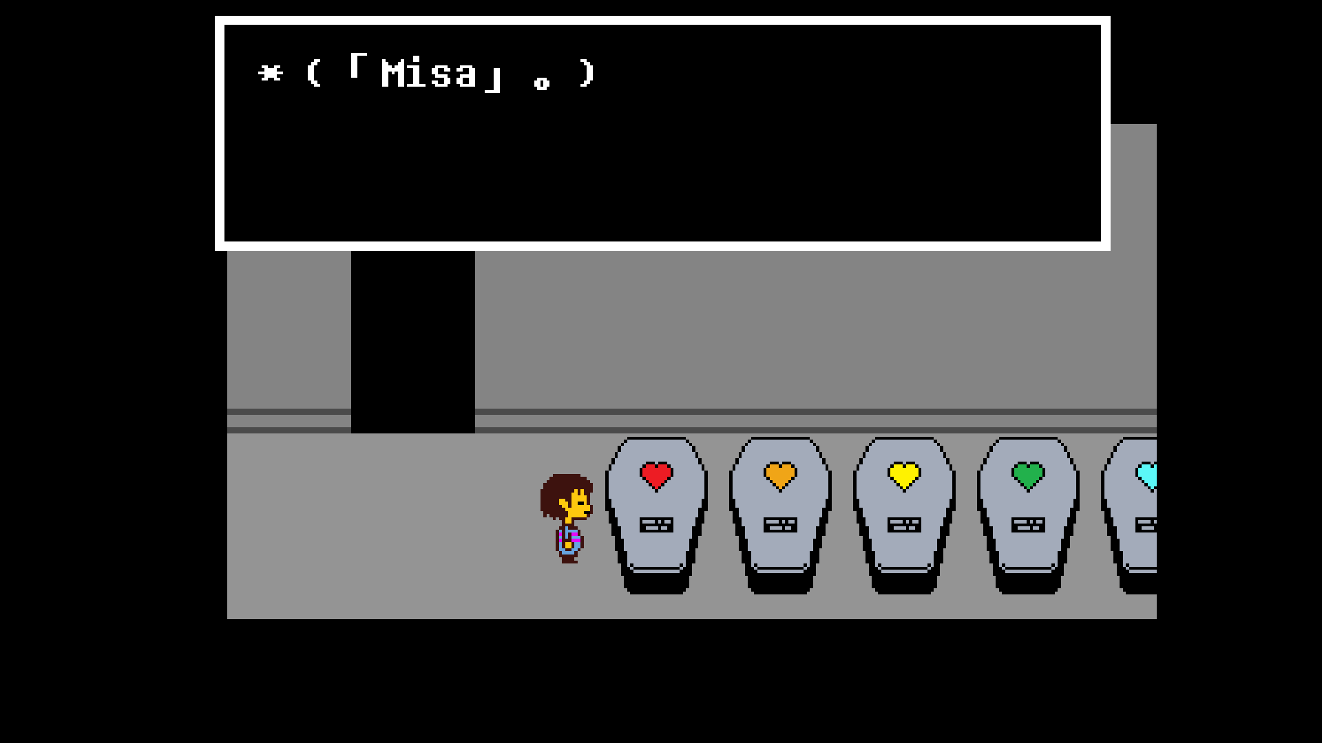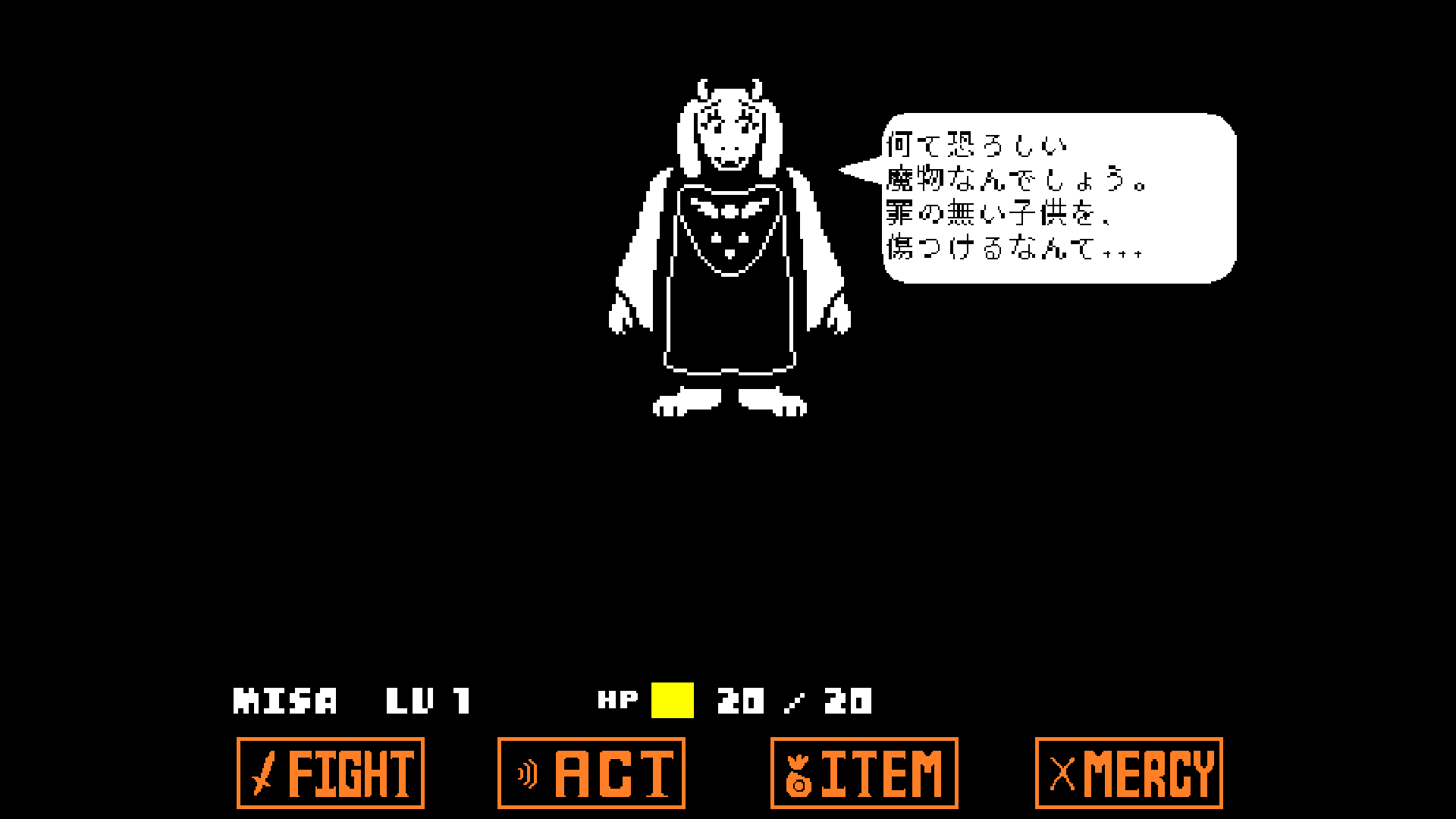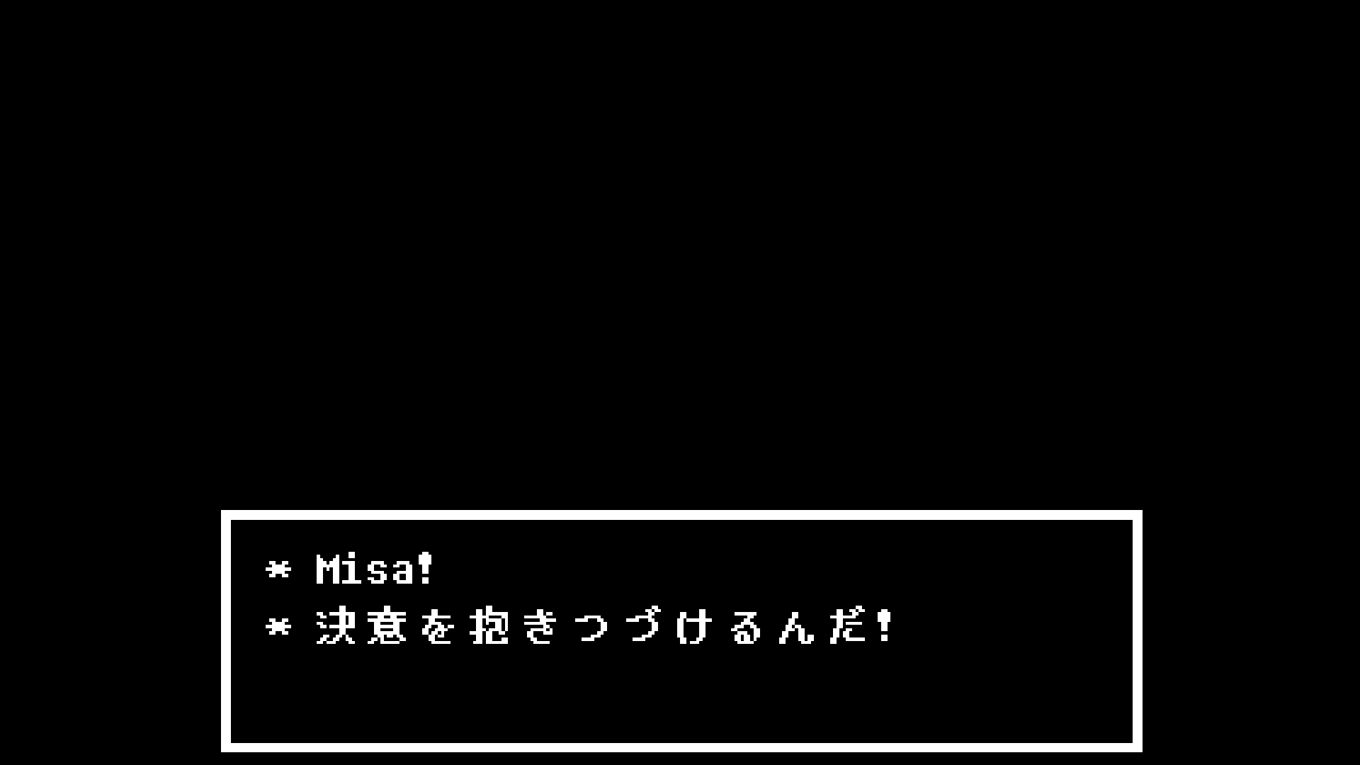 ところで、今回主人公の名前は「Misa」にした。主人公の名前をつけるときは手癖でつける名前だが、週末に教会に行ってやるミサ(これはMissaという綴り)に引っ掛けられて結構好きな名前なのだ。その「Misa」とASRIELの関係もこのステージでやや明らかになってきた。エンディング直前でこのゲームの「Misa」はそこまで良い奴じゃなかったかも、とASRIEL自身から語られたときは、自分をなじられているようで複雑な心境。意地の悪いゲームだこと。