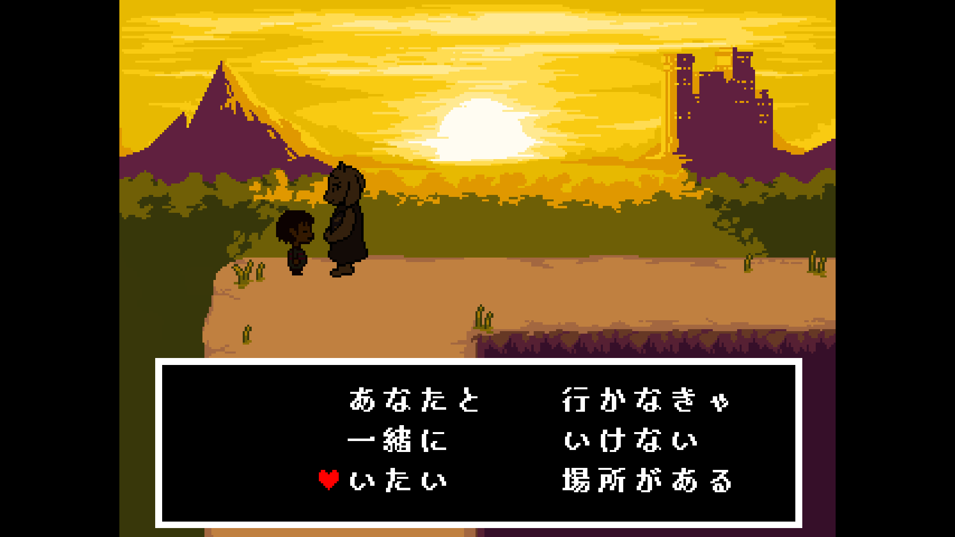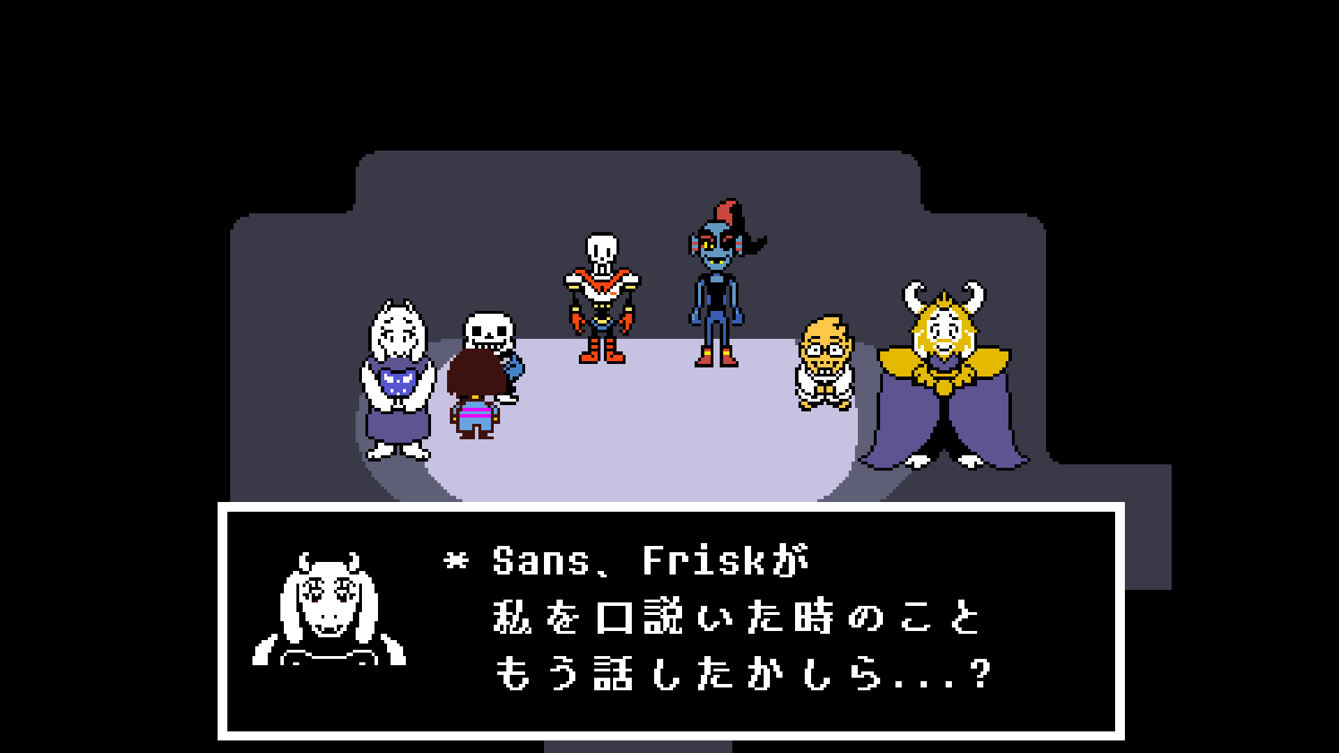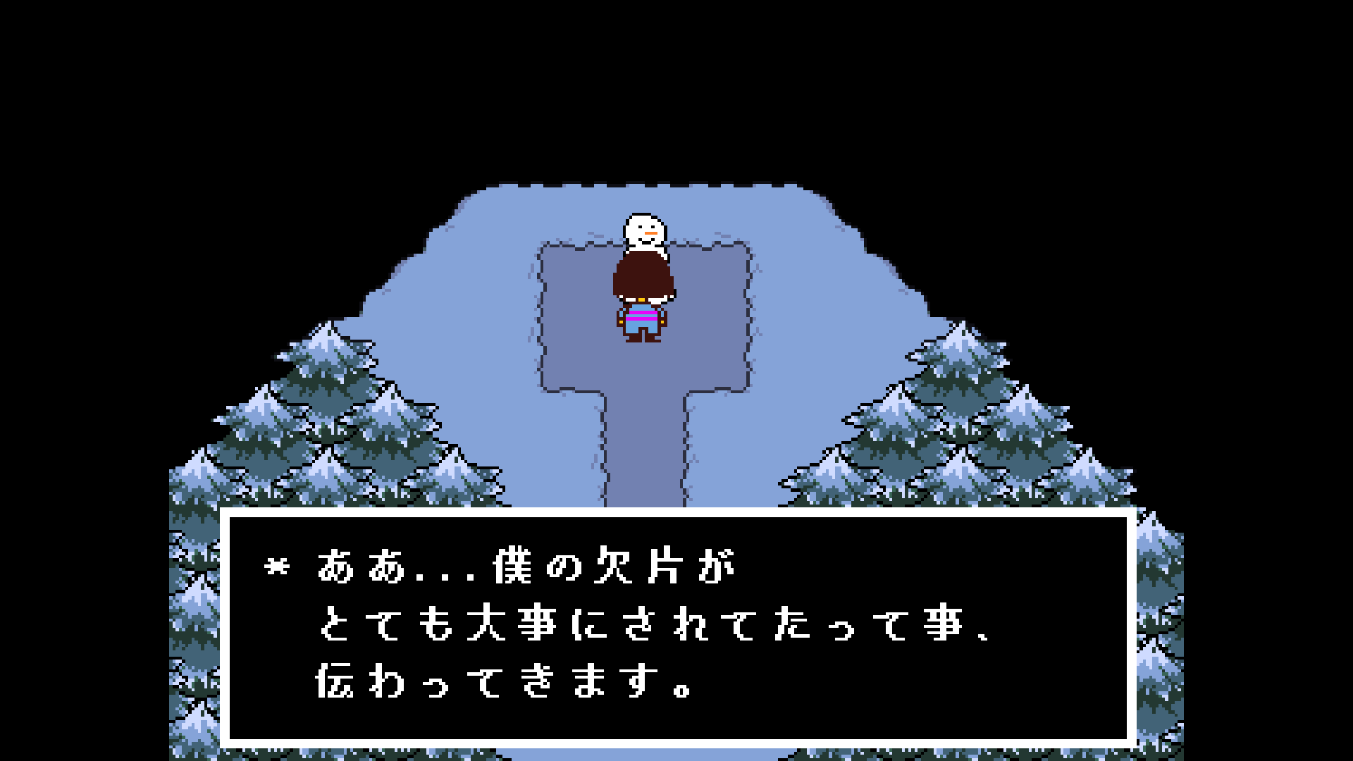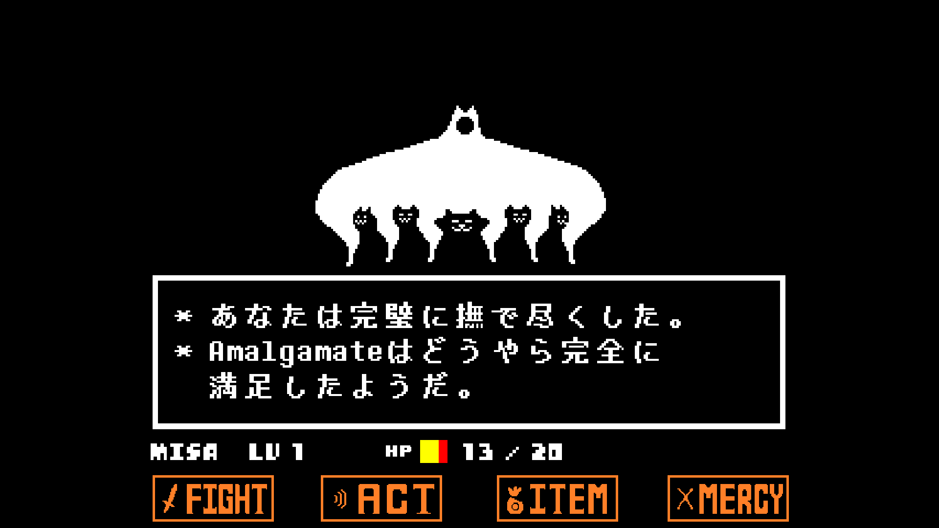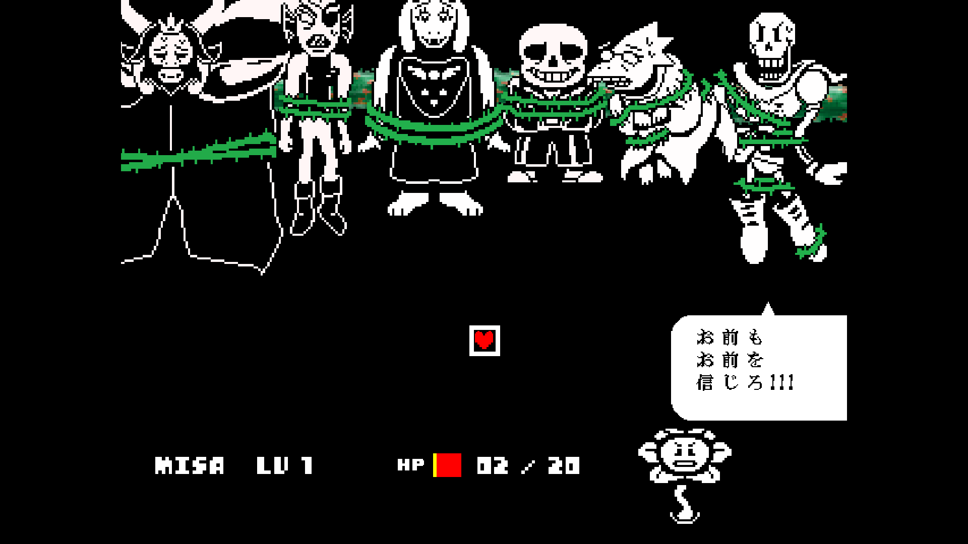 ところで、今回主人公の名前は「Misa」にした。主人公の名前をつけるときは手癖でつける名前だが、週末に教会に行ってやるミサ(これはMissaという綴り)に引っ掛けられて結構好きな名前なのだ。その「Misa」とASRIELの関係もこのステージでやや明らかになってきた。エンディング直前でこのゲームの「Misa」はそこまで良い奴じゃなかったかも、とASRIEL自身から語られたときは、自分をなじられているようで複雑な心境。意地の悪いゲームだこと。