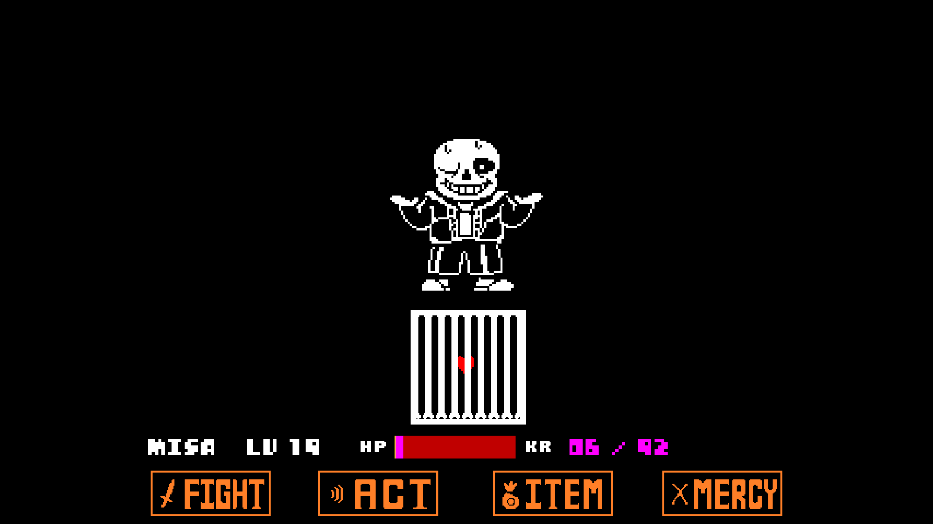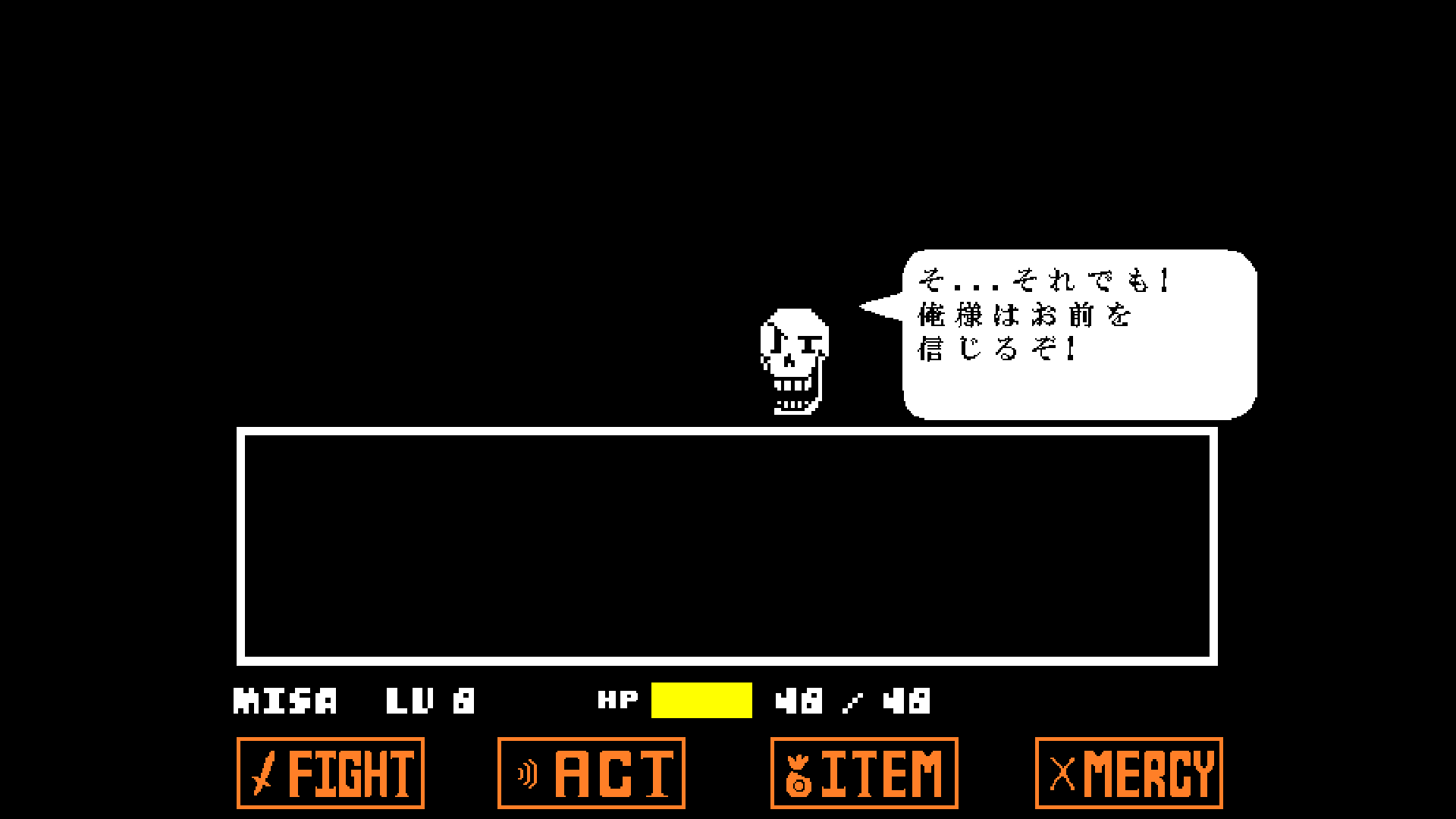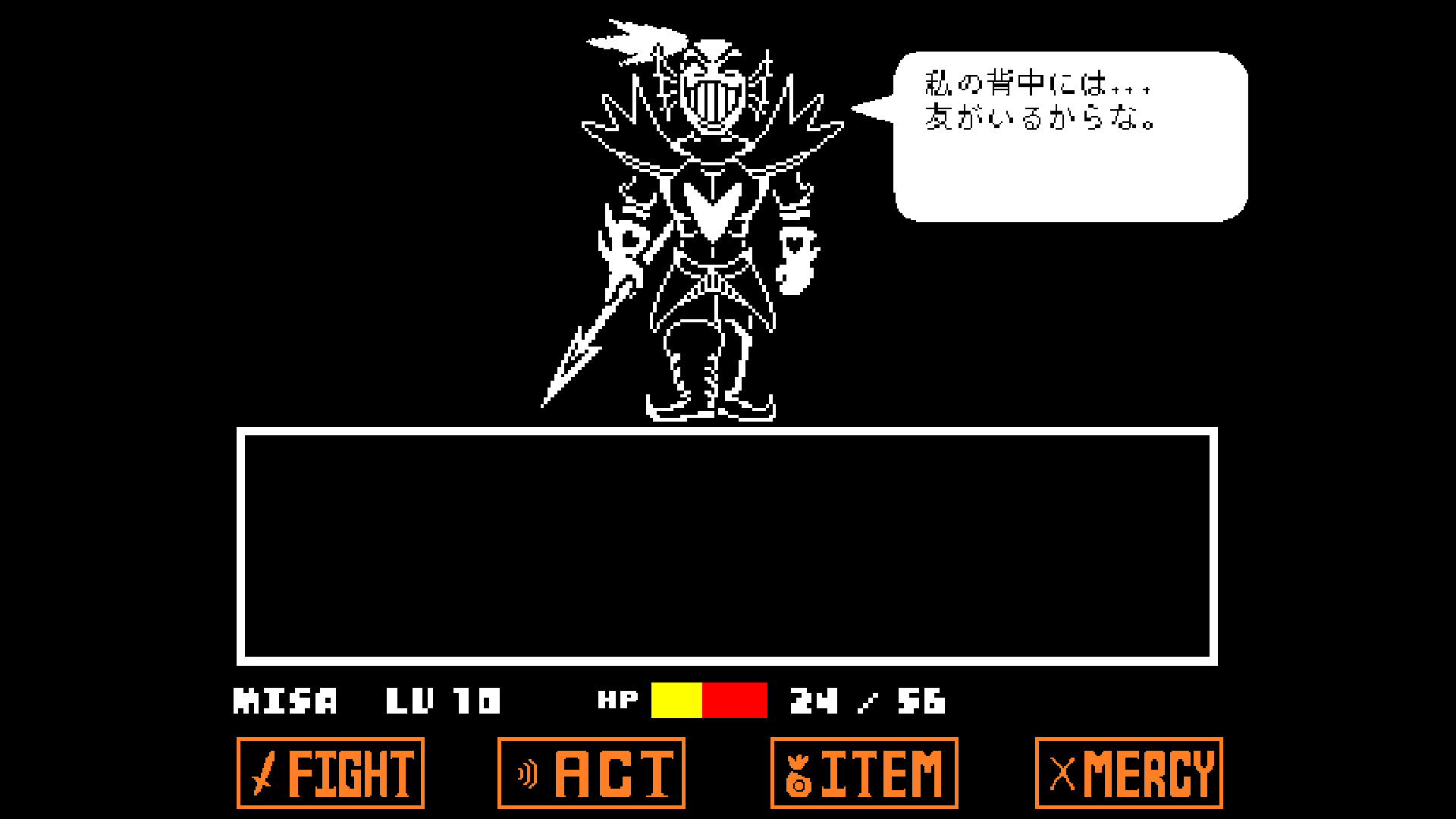 余談だが、Sans戦で学者装備?(Gersonの店で売ってるやつ)をするとKarma値の減少スピードが下がるっぽい。右下押しっぱなしで0ターン目の攻撃を食らってみると、確かにナイフとロケット装備のときよりノートとメガネ装備のときの方が死ぬまでの時間がちょっと長い。というわけでSans戦の主人公はメガネっ娘でノートを武器に戦っていたとさ。