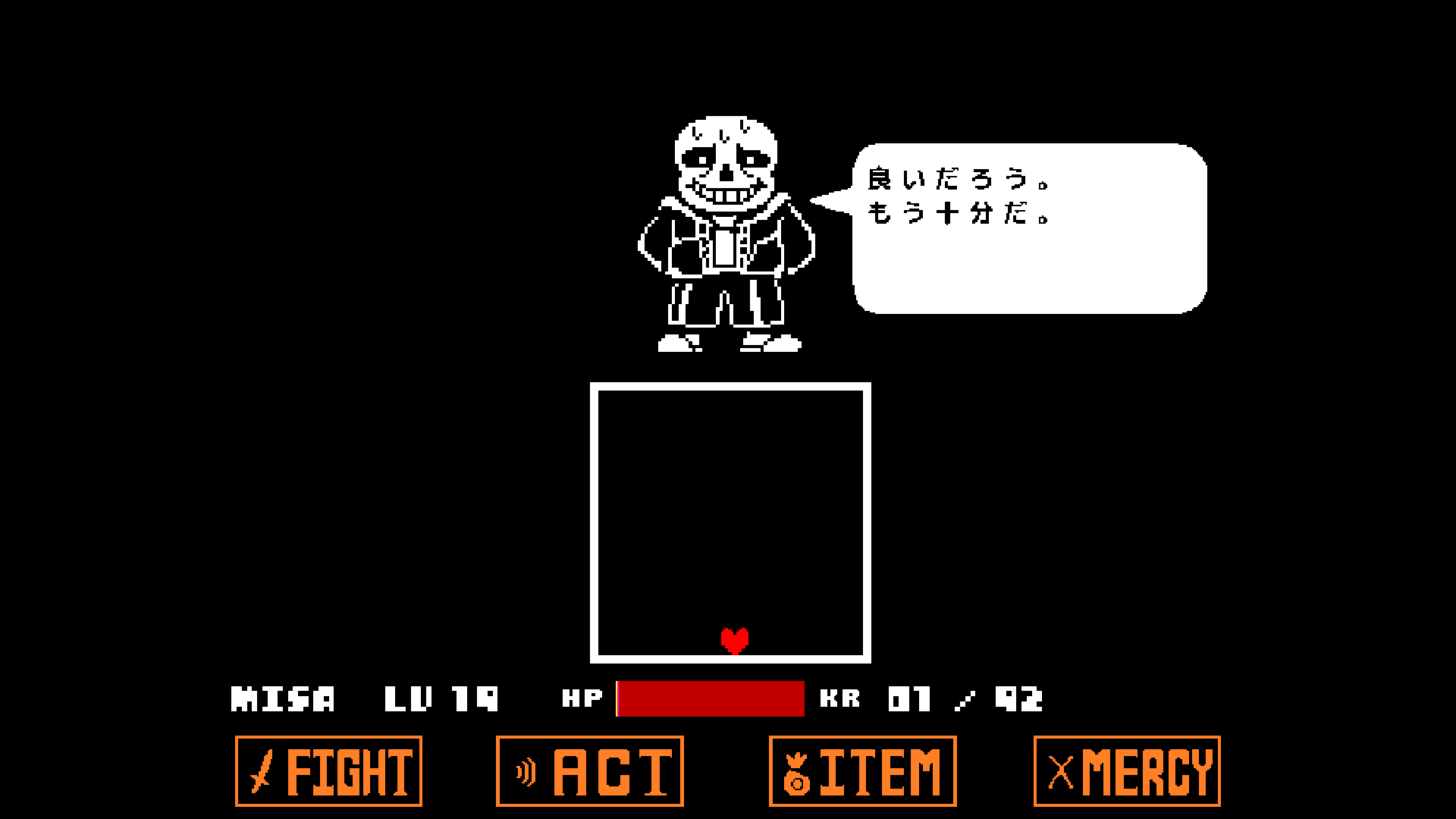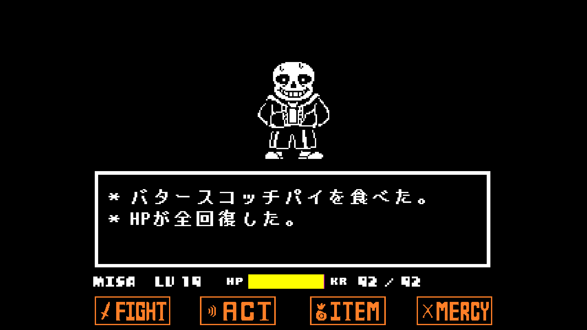 んで。Sansが強い。前口上のTorielさんに向けての泣けるセリフで「やっぱ戦いたくねぇ……」と思ってたら2ターン目で死んだ。ここで1週間は詰まってたんで、ここまでの物語としての感慨とかはすっかり抜けて、ゲーマーとして「負けられねぇ……」という使命感によるプレーに成り代わっていた。